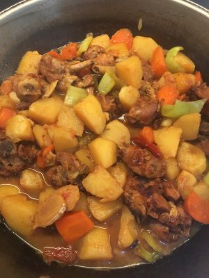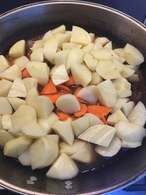 把胡萝卜块土豆块放到鸡肉上,加上热水适量,如需要汤汁多一些,多加水,焖煮至胡萝卜土豆绵软,不是烂糊啊