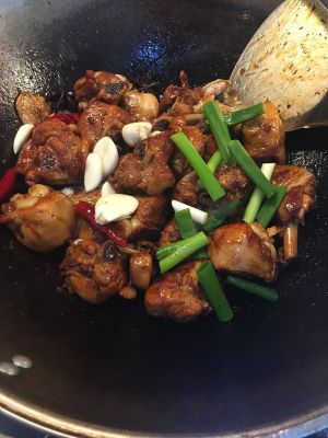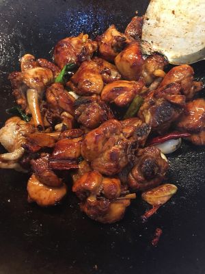 倒上炒好的大盘鸡。