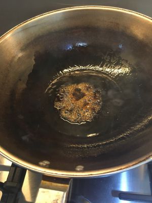 把鸡腿斩段,放冷水中煮沸3分钟,用温水洗净备用。热炒锅,放橄榄油适量,把白糖放入,炒糖色,如图所示