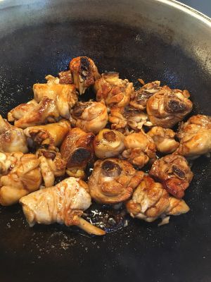 等糖烧至泡泡时,把鸡块放入翻炒