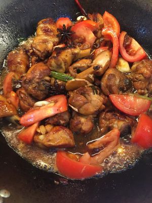把切好的西红柿块放入,倒入生抽和花雕酒,焖煮片刻