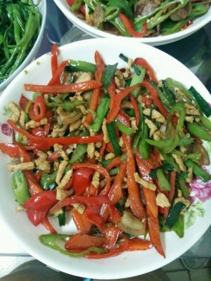 油温微热,加点盐进去、然后胡萝卜下锅翻炒至胡萝卜变软加青椒丝儿进去,最后是肉、放点糖调味就OK啦!