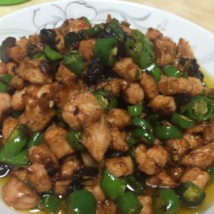 锅里放油,肉里加入蛋白下锅炒然后加入尖椒和豆豉翻炒,最后加一点鸡粉和丁点麻油就ok啦!