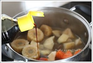 接下来倒入料酒 盐。生抽。少许老抽上色