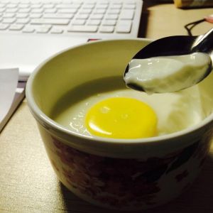 另一边的牛奶在冷却。把奶皮揭开一些,碗里的奶顺着揭开的口子倒出一大半,记得别破坏奶皮。把倒出的奶与蛋清混合,打匀,但不要打得太过,因为打出泡沫做出来就不美观了呢。下面一步很关键哦,也很考验耐心,把与蛋清打匀后的牛奶顺着揭开的口子倒回碗里去。