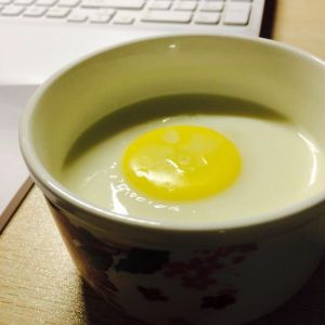 等糖、蛋清、牛奶完全混合后。将混合物上的泡泡用汤匙舀出,倒掉。接着将混合物沿牛奶皮的孔轻轻倒入刚刚热牛奶的碗中。