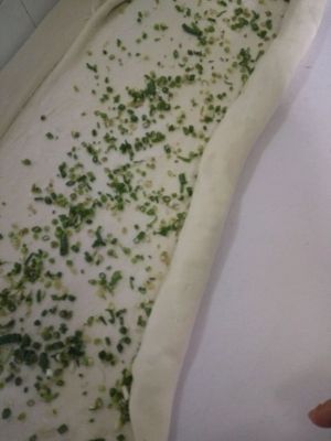 和好面,揉至光滑有劲儿,然后擀成一张大面皮,薄一点比较好吃。然后在面皮表面均匀涂上油,撒上盐和葱花。从面皮一头慢慢把面皮圈起来,变成一个长面卷。