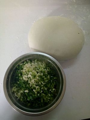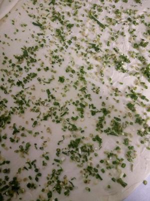 抹好猪油,把切好的小葱和猪油渣均匀的撒上