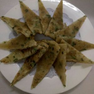 然后把面剂擀成面片,放平底锅里煎(用电饼铛最好)煎到两面金黄就熟了,切好摆盘