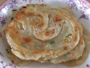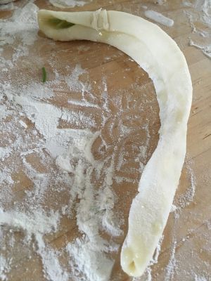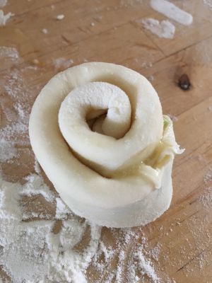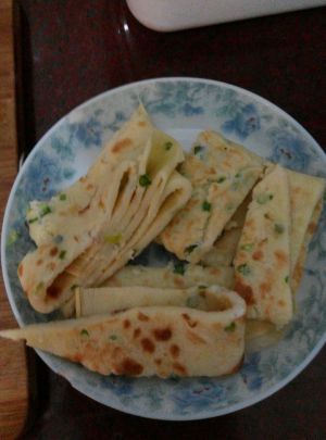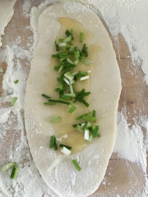 然后把面擀成片状!刷上一层油,撒上葱花和盐。