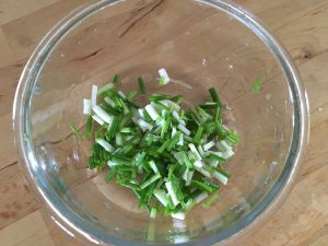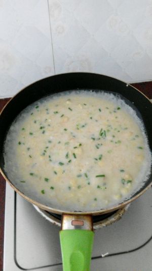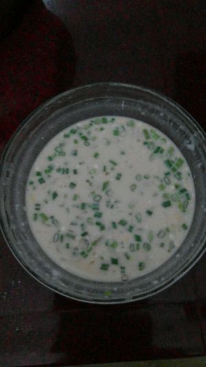 将面粉加'适量的水和盐搅均匀,之后加入鸡蛋及葱花再搅均匀。