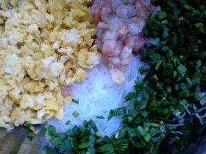 馅料的调法: 韭菜洗净控干水分,鸡蛋2—3个,虾皮适量。