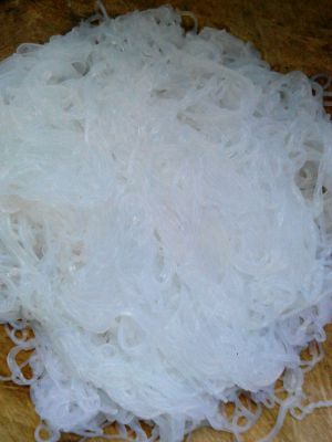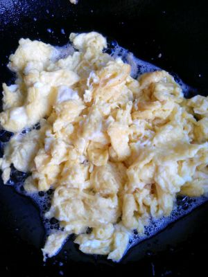 炒2个鸡蛋碎,沸水浸发粉丝。