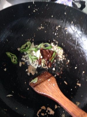 炒几下,放点盐,放进去点水炖一二分钟,最后出锅前放水淀粉。