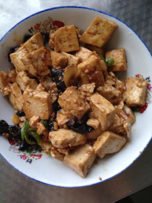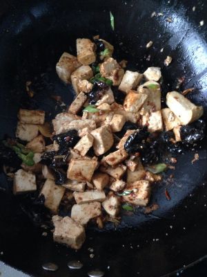 先炒木耳,木耳炒的过程会有炸的声音,炒着快熟加豆腐
