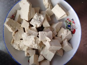 豆腐切块,五花肉、青红椒、姜蒜切片;