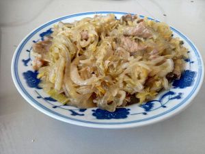 所有食材洗净,五花肉切成0.5厘米的肉片,大白菜切段,宽苕粉洗净(无需浸泡)。