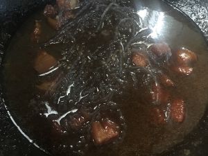 加入白菜木耳,导入水,放入八角,炖煮