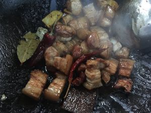 五花肉切片,热油煎至微黄后加入干辣椒、八角、蒜片