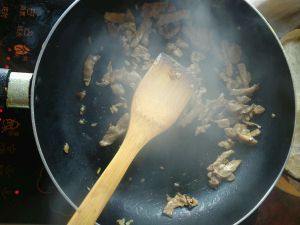 起油锅,放入生姜,热油锅,倒入猪肉翻炒。