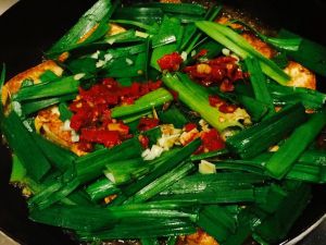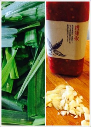 配料: 蒜苗丝段, 姜片, 蒜粒, 糟辣椒