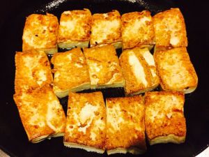 慢火将豆腐煎炸至金黄色