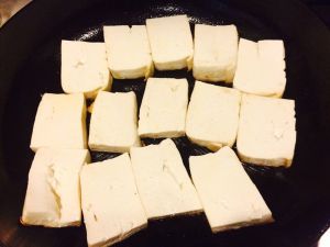 平锅烧热, 可以喷一种叫Spam的油不粘锅; 还有一招, 可适用于煎鱼等等。 没有不粘锅, 也没有不粘锅的油, 稀里糊涂码好如图的豆腐片(或鱼), 才发现糟糕, 沾了。 不着急, 让它们一边煎金黄色沾着锅, 关火。 凉些时, 就很容易翻了; 继续另一面!