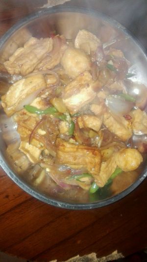 锅中加少许油,热后,下肉片炒散,再放入黄豆酱炒香,然后加料酒,之后加豆腐片,青椒,木耳,加水,酱油,盐调味,烧4分钟左右,让豆腐入味,再加入味精,用水淀粉勾芡,即可。