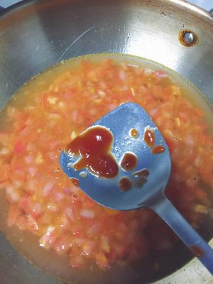 炒至番茄软烂出沙,加入一勺番茄酱