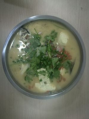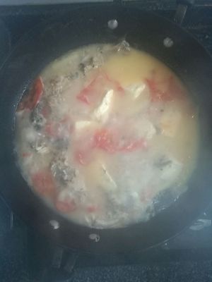 待鱼汤初呈奶白色时,加入切好的番茄,再烹煮约五分钟 至汤色较浓时放入和水豆花 烧开后加入适量的盐,调味之后即可起锅