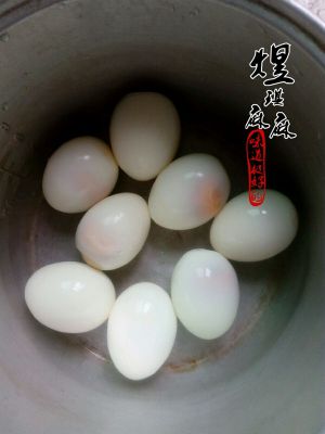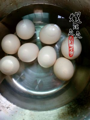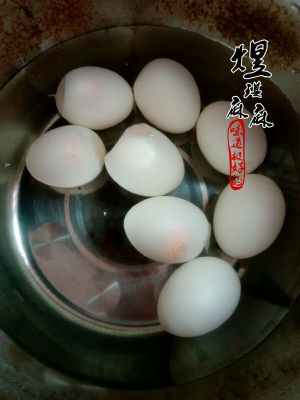 所有调料(耗油,自然鲜不加)泡水(家用超滤饮水机纯水,为了干净),加热煮沸,冷却10分钟。再加入鸡蛋煮10分钟。捞出鸡蛋挨个敲碎。