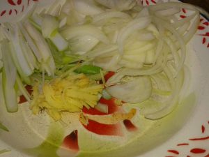 将羊肉切片或切丝 ,洋葱、葱、姜 切丝,蒜切片