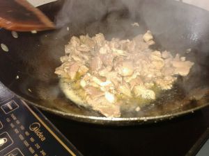 锅里放油,比炒菜多一点,放入羊肉,炒到变色。