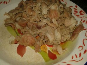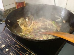放入葱姜丝,料酒,炒到葱变软。倒入胡椒粉,孜然粉和盐调味。