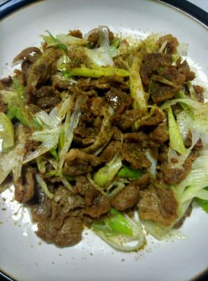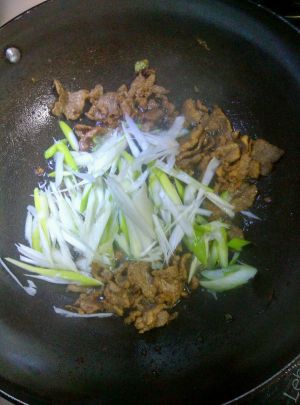 鲜羊肉要多炒一会,快熟了加入切好的大葱,翻炒几下出锅。