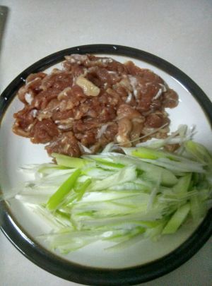 先将切成片的鲜羊肉用老抽料酒和淀粉腌制十五分钟,大葱切斜段备用