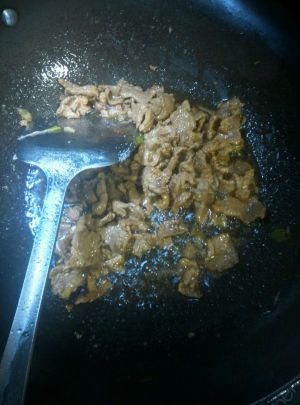 炒锅放油放入大料到九成热放腌好的羊肉,爆炒在放入适量料酒酱油,放少量糖炒至羊肉熟放入大葱