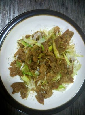 放入适量盐大火翻炒两分钟关火放少量鸡精即可,浓香葱爆羊肉就完成了
