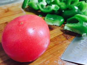 茄子,土豆基本软烂(用筷子可戳破)后拨至一边,入西红柿煎炸。