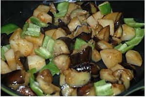 放入茄子块,炒到茄子和土豆变成金黄色,捞出备用