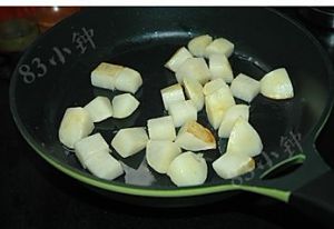 热锅放油,油热后,下土豆块煎至两面金黄且半熟