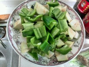 土豆茄子去皮切块,青椒切块. 土豆切块或者稍厚的片,茄子滚刀切块不要太小,青椒随便