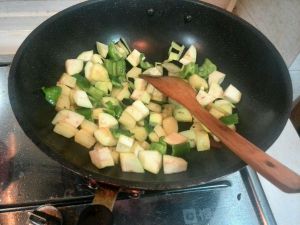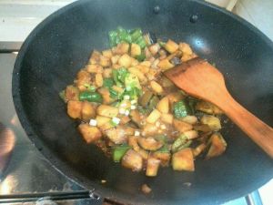 炒锅加热,然后放入控好油的茄子、土豆和青椒。