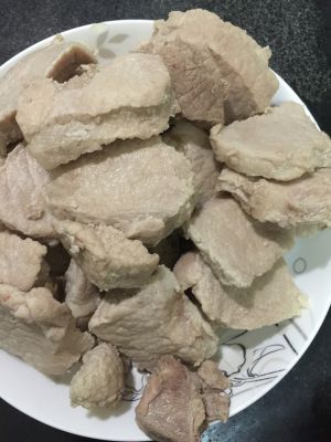 先将猪肉焯水后,用温水洗净后,猪肉连同数片姜片和一小段葱白放入电压力锅内,把肉压到用筷子轻轻一挫就穿过后,取出熟肉。