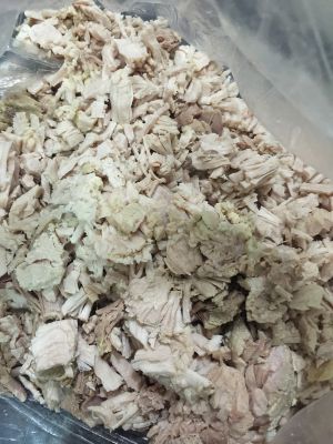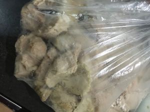 找个干净的袋子,趁热把肉放进去,用个工具把肉压扁压散。