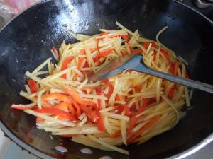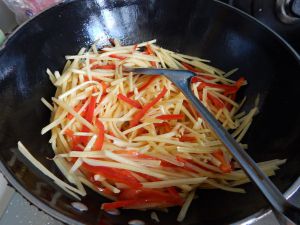 再倒入土豆丝炒个7分熟,加水和酱油耗油盖上锅盖焖熟,直到收汁,