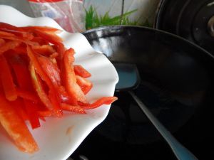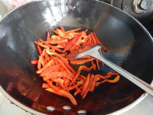 油热后 放入辣椒段 因为在锅正上当拍的 所以照片有点模糊