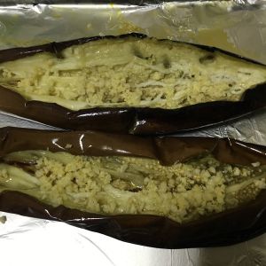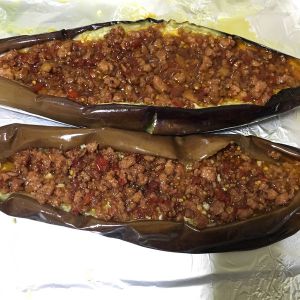 取出烤盘,把料汁用小勺从刀口处加入茄子里,再送入烤箱,烘烤12分钟,大功告成。
