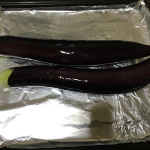 长茄子洗净,擦去表面水分,用刀在表面划开,不用划通,划四分之三长。放入铺好锡纸的烤盘,200度,烘烤10分钟。
