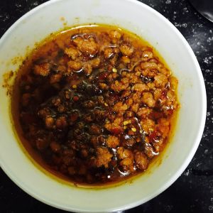准备有豆瓣酱 肉馅 白糖 胡椒粉 盐。蒜不下锅炒。一会再用